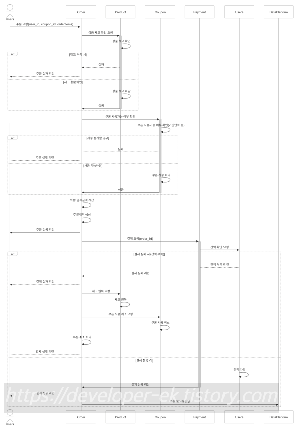 선택한 시나리오는 이커머스 시스템의 상품주문 서비스였다. 시퀀스 다이어그램은 Mermaid(https://www.mermaidchart.com/)를 사용하여 그렸다.