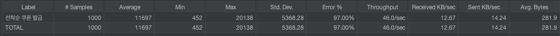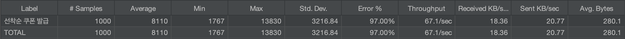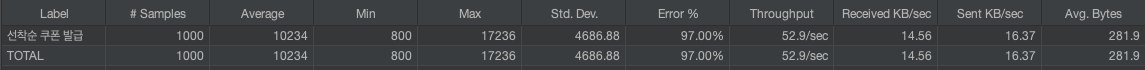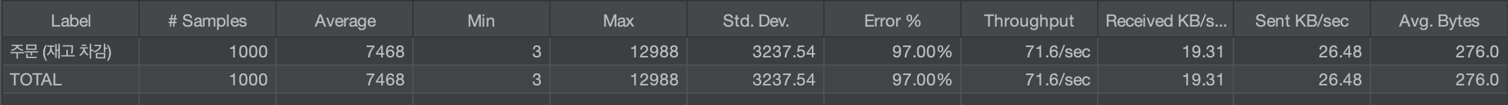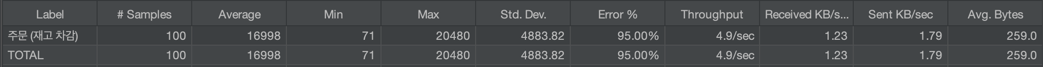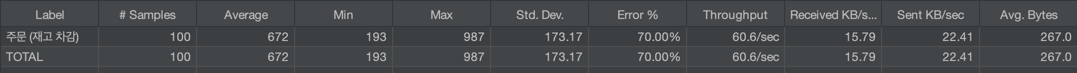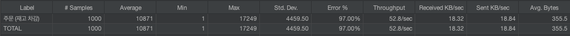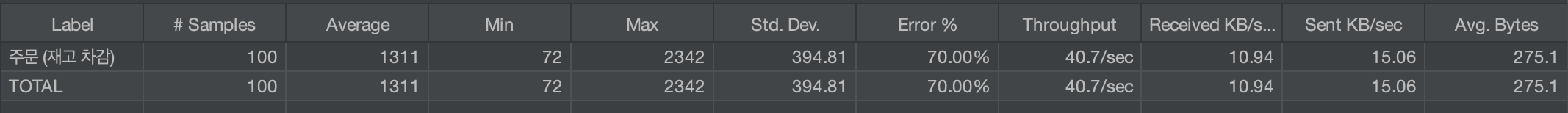 하지만 낙관적 락을 도입할 경우 에러가 60% 발생하는 반면, 비관적 락은 에러 0% 발생으로 모든 호출이 성공하는 것을 확인할 수 있다.