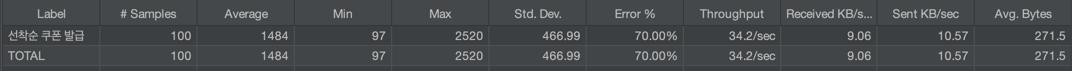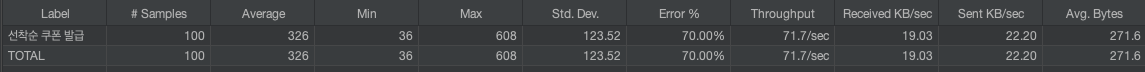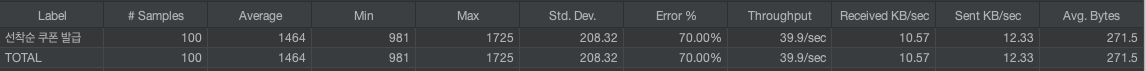 쿠폰의 잔여 수량이 30개인 경우 100명의 서로 다른 유저가 동시에 쿠폰 발급 API를 호출하는 케이스를 테스트하였다.