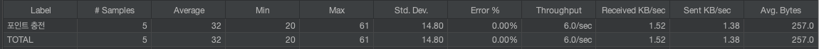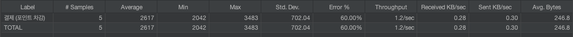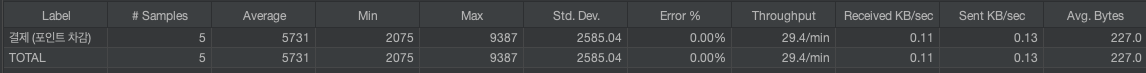 포인트 차감에 대해서는 동일한 유저가 동시에 5번(충돌 가능성 낮음을 가정)을 호출하는 케이스를 테스트하였다.