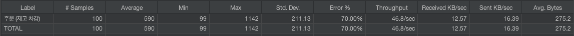 재고가 30개인 경우 100명의 서로 다른 유저가 동시에 결제(재고 차감) API를 호출하는 케이스를 테스트하였다.