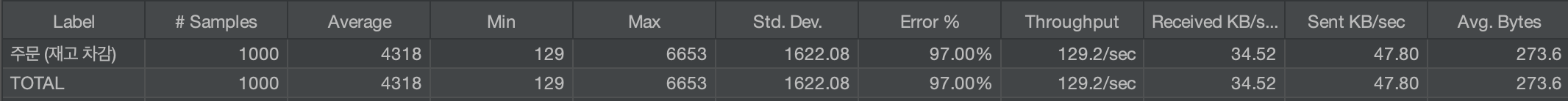 결제의 경우에는 5번 호출임에도 Average, Max 에서 차이가 발생하는 것을 확인할 수 있었다. (낙관적 락 우세)