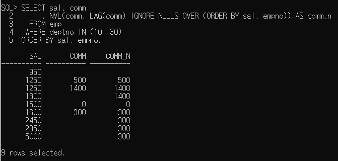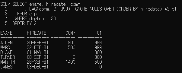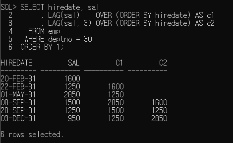LAG 함수는 현재 행에서 offset 이전 행의 value_expr을 반환한다. offset은 행 기준이며 기본값은 1이다. default에 이전 행이 없을 경우 반환할 값을 지정할 수 있다. default의 기본값은 널이다.