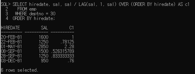 LAG 함수는 현재 행에서 offset 이전 행의 value_expr을 반환한다. offset은 행 기준이며 기본값은 1이다. default에 이전 행이 없을 경우 반환할 값을 지정할 수 있다. default의 기본값은 널이다.