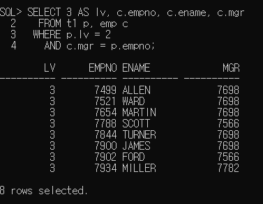 CONNECT BY절로 임시 테이블에 저장된 1단계 결과와 emp테이블을 조인한다. CONNECT BY절도 WHERE절과 유사하게 동작한다.