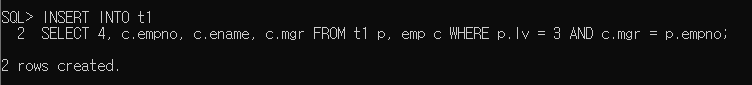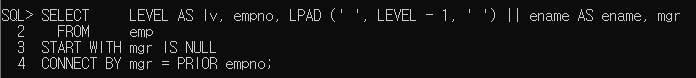 | CONNECT BY 절 | 루트 노드의 하위 노드를 생성하며 조회 결과가 없을 때까지 반복 수행 |