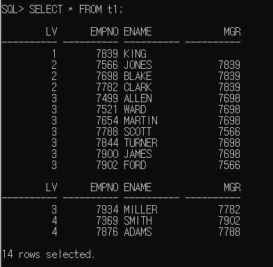 CONNECT BY절로 임시 테이블에 저장된 1단계 결과와 emp테이블을 조인한다. CONNECT BY절도 WHERE절과 유사하게 동작한다.
