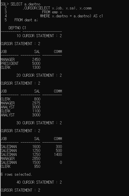 CURSOR 표현식은 서브 쿼리의 결과를 중첩 커서(nested cursor)로 반환한다. 중첩 커서는 PL/SQL의 REF CURSOR와 동일한 유형이다.
