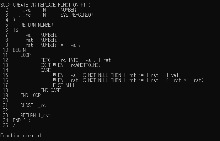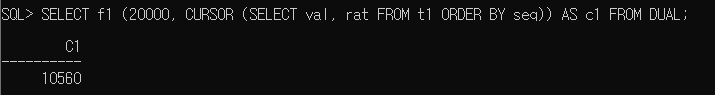 다음과 같이 금액(i_val)을 할인하는 함수를 생성하자. 두 번째 매개변수가 SYS_REFCURSOR타입이다.