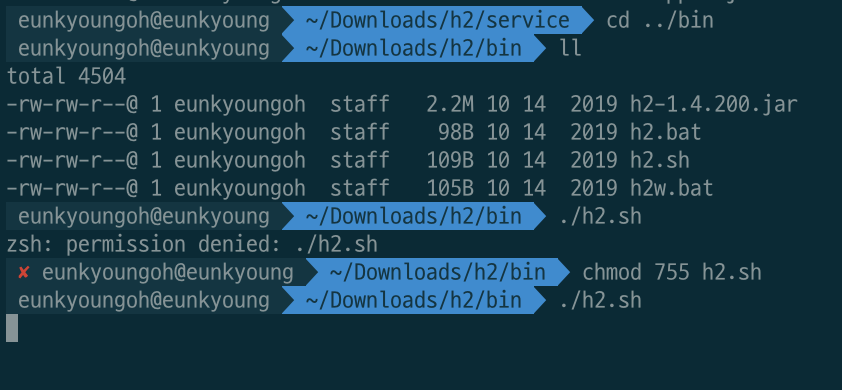 파일 압축 해제 후 h2/bin 폴더로 가서 h2.sh 파일 실행(파일 권한 변경 필요)